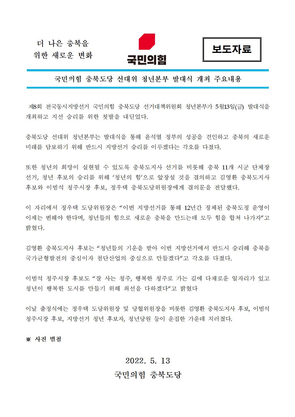 Á¦¸ñ [º¸µµÀÚ·á]±¹¹ÎÀÇÈû ÃæºÏµµ´ç ¼±´ëÀ§ û³âº»ºÎ ¹ß´ë½Ä °³ÃÖ ÁÖ¿ä³»¿ë