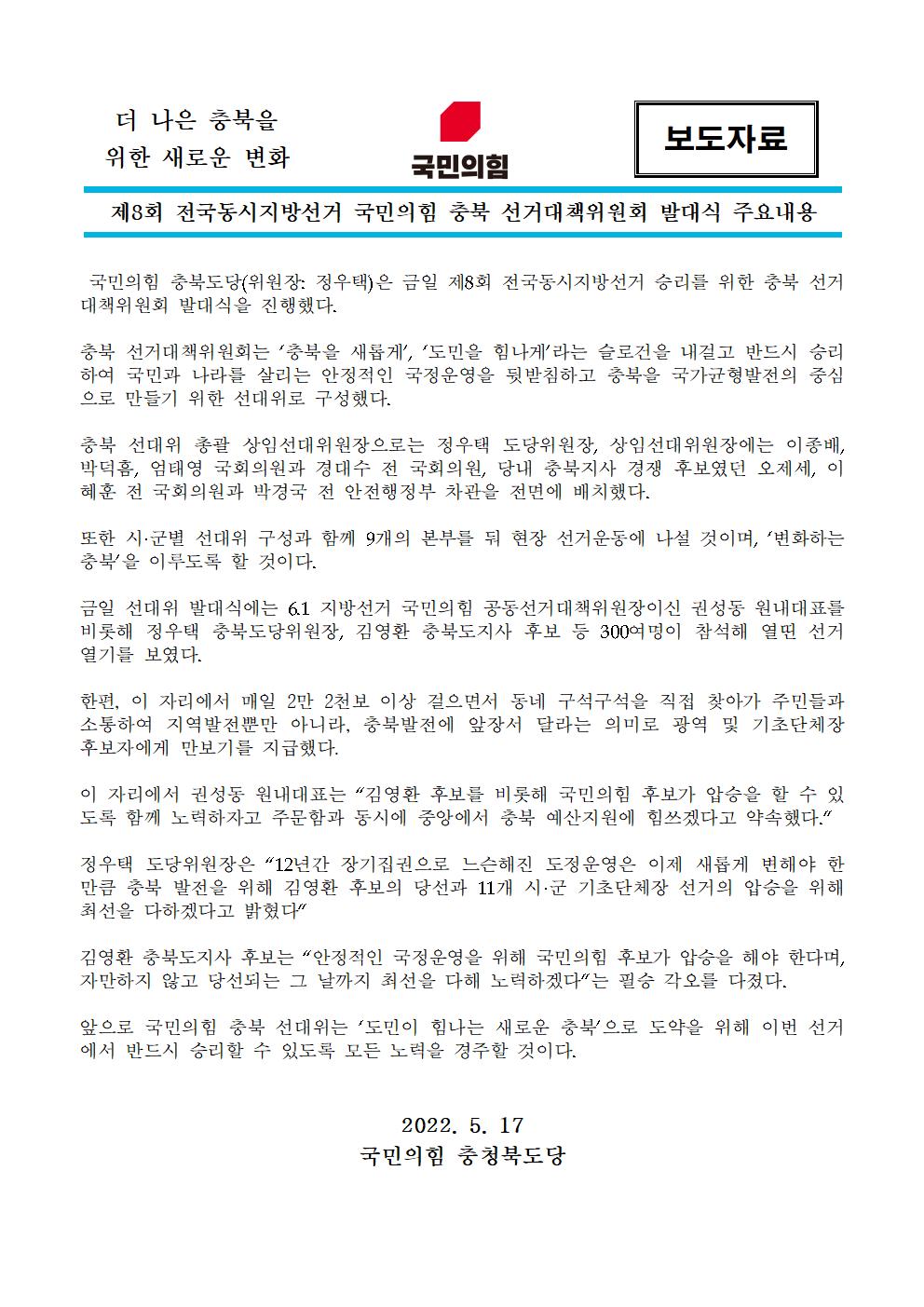Á¦¸ñ [º¸µµÀÚ·á]Á¦8ȸ Àü±¹µ¿½ÃÁö¹æ¼±°Å ±¹¹ÎÀÇÈû ÃæºÏ ¼±°Å´ëÃ¥À§¿øÈ¸ ¹ß´ë½Ä ÁÖ¿ä³»¿ë