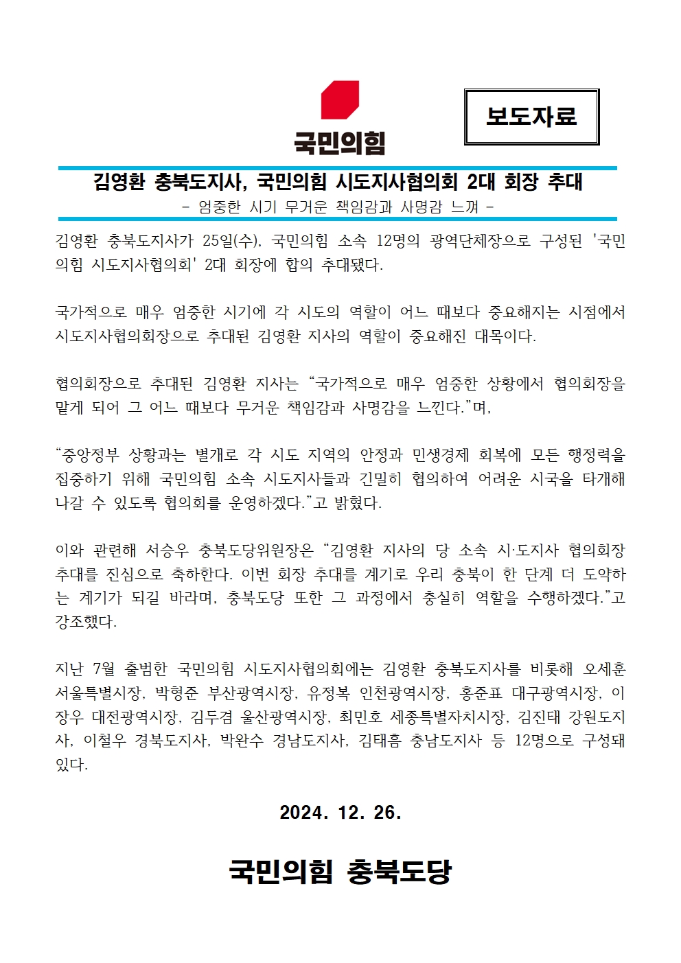 Á¦¸ñ 20241226 ±è¿µÈ¯ ÃæºÏµµÁö»ç, ±¹¹ÎÀÇÈû ½ÃµµÁö»çÇùÀÇȸ 2´ë ȸÀå Ãß´ë