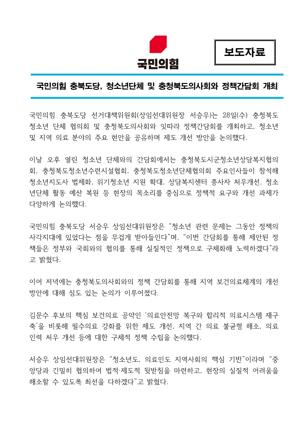 Á¦¸ñ 20250529 ±¹¹ÎÀÇÈû ÃæºÏµµ´ç, û¼Ò³â´Üü ¹× ÃæÃ»ºÏµµÀÇ»çȸ¿Í Á¤Ã¥°£´ãȸ °³ÃÖ