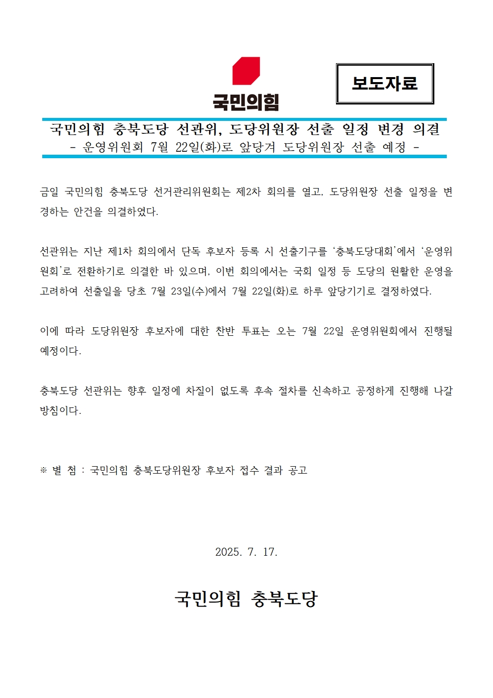 Á¦¸ñ 20250717 ±¹¹ÎÀÇÈû ÃæºÏµµ´ç ¼±°üÀ§, µµ´çÀ§¿øÀå ¼±Ãâ ÀÏÁ¤ º¯°æ Àǰá