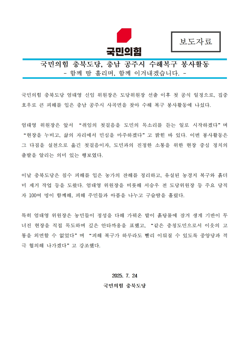 Á¦¸ñ 20250724 ±¹¹ÎÀÇÈû ÃæºÏµµ´ç, Ãæ³² °øÁÖ ¼öÇØº¹±¸ ºÀ»çȰµ¿