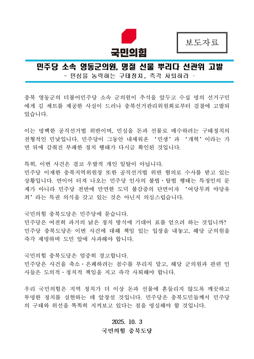 Á¦¸ñ 20251003 ¹ÎÁÖ´ç ¼Ò¼Ó ¿µµ¿±ºÀÇ¿ø, ¸íÀý ¼±¹° »Ñ¸®´Ù ¼±°üÀ§ °í¹ß