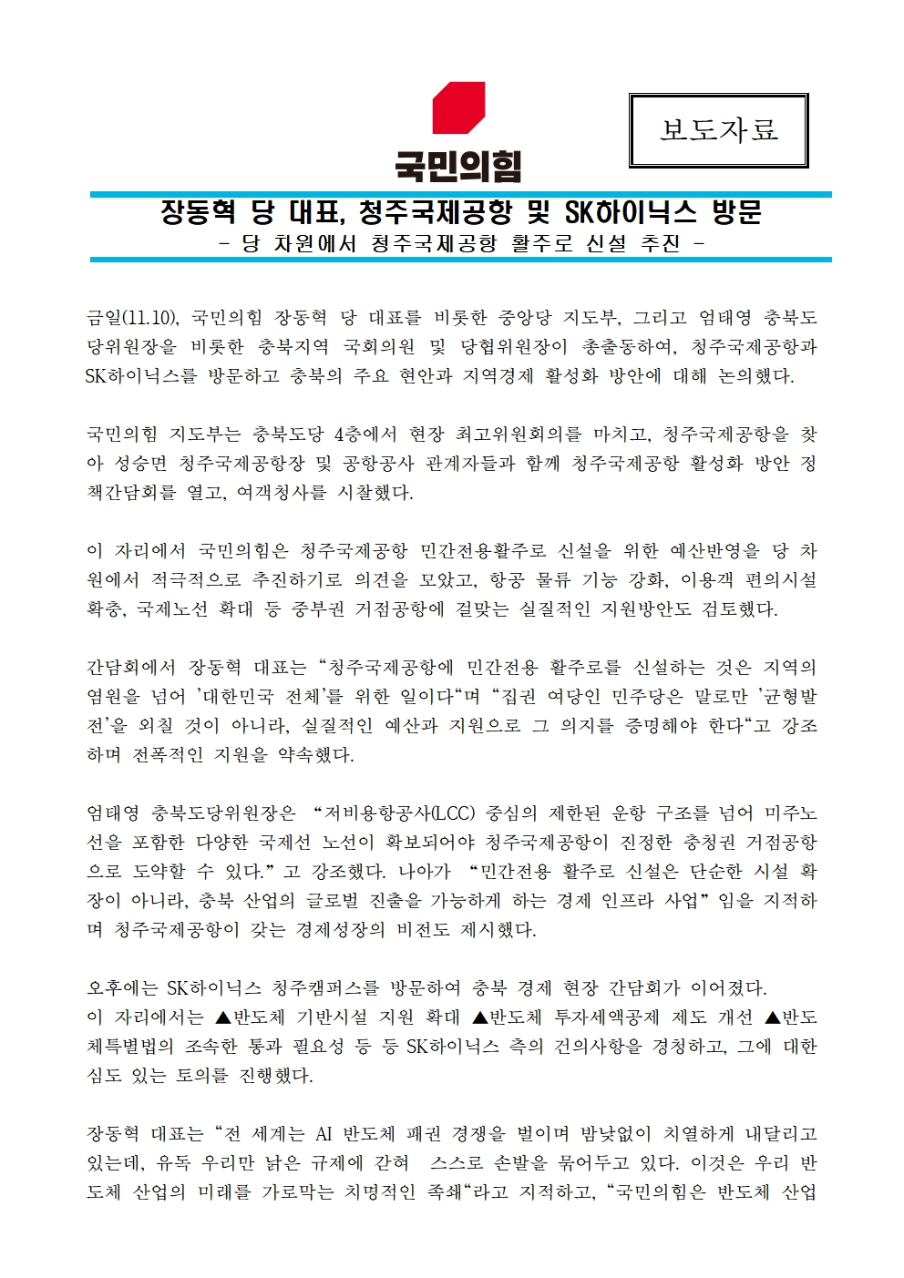 Á¦¸ñ 20251110 À嵿Çõ ´ç ´ëÇ¥, ûÁÖ±¹Á¦°øÇ× ¹× SKÇÏÀ̴нº ¹æ¹®