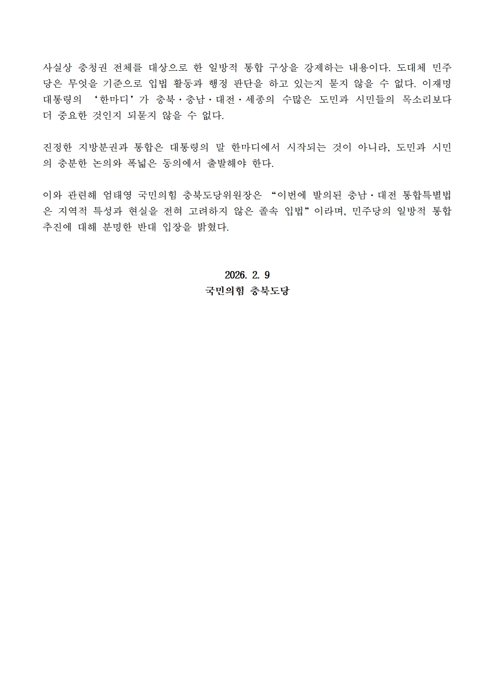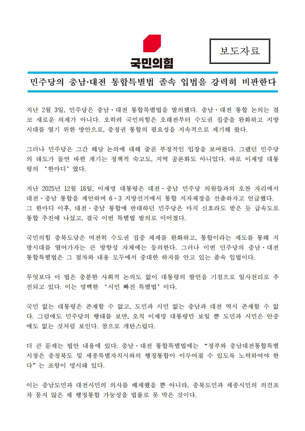 Á¦¸ñ 20260209 ¹ÎÁÖ´çÀÇ Ãæ³²¡¤´ëÀü ÅëÇÕÆ¯º°¹ý Á¹¼Ó ÀÔ¹ýÀ» °­·ÂÈ÷ ºñÆÇÇÑ´Ù