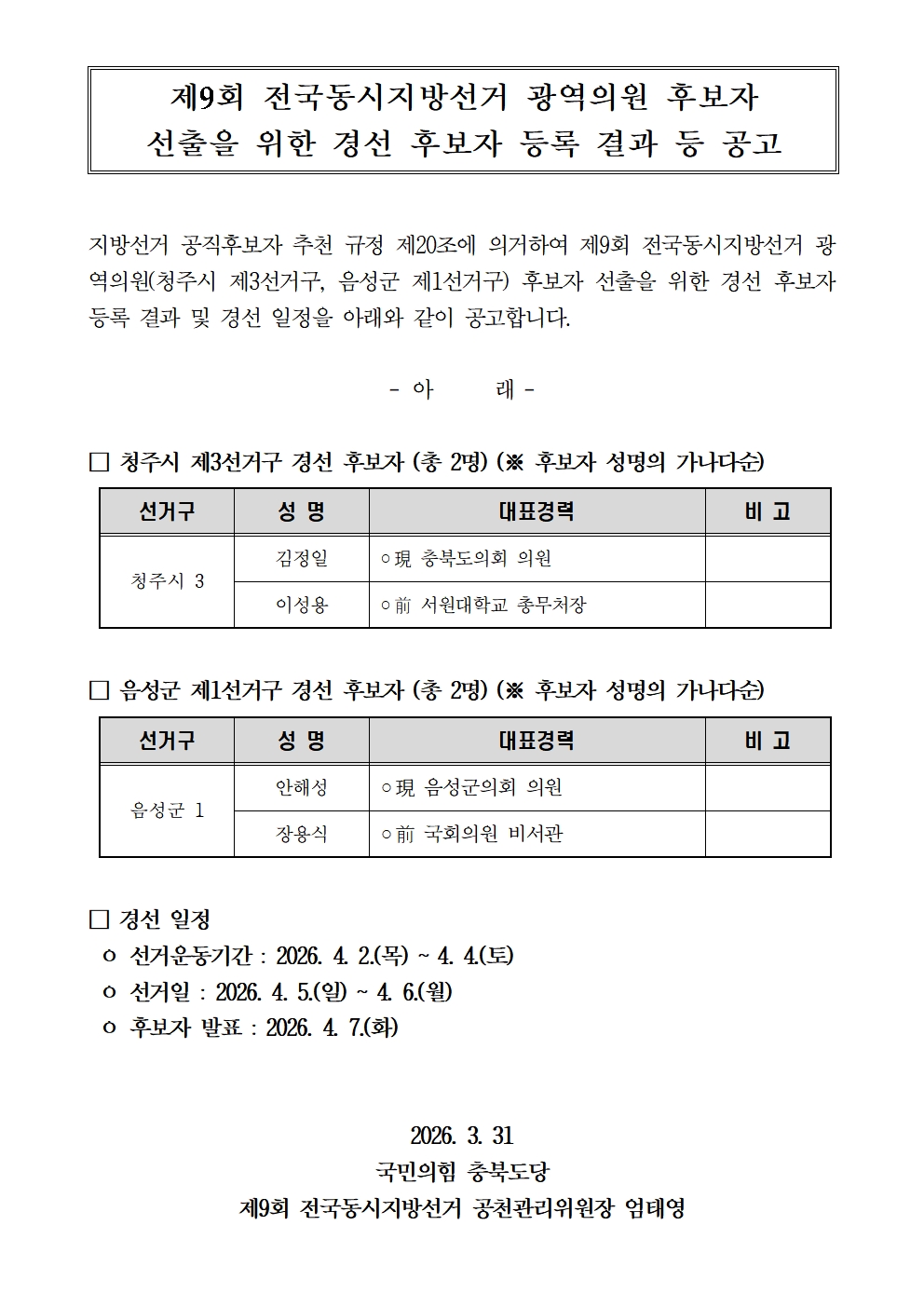 Á¦¸ñ Á¦9ȸ Àü±¹µ¿½ÃÁö¹æ¼±°Å ±¤¿ªÀÇ¿ø Èĺ¸ÀÚ ¼±ÃâÀ» À§ÇÑ °æ¼± Èĺ¸ÀÚ µî·Ï °á°ú µî °ø°í