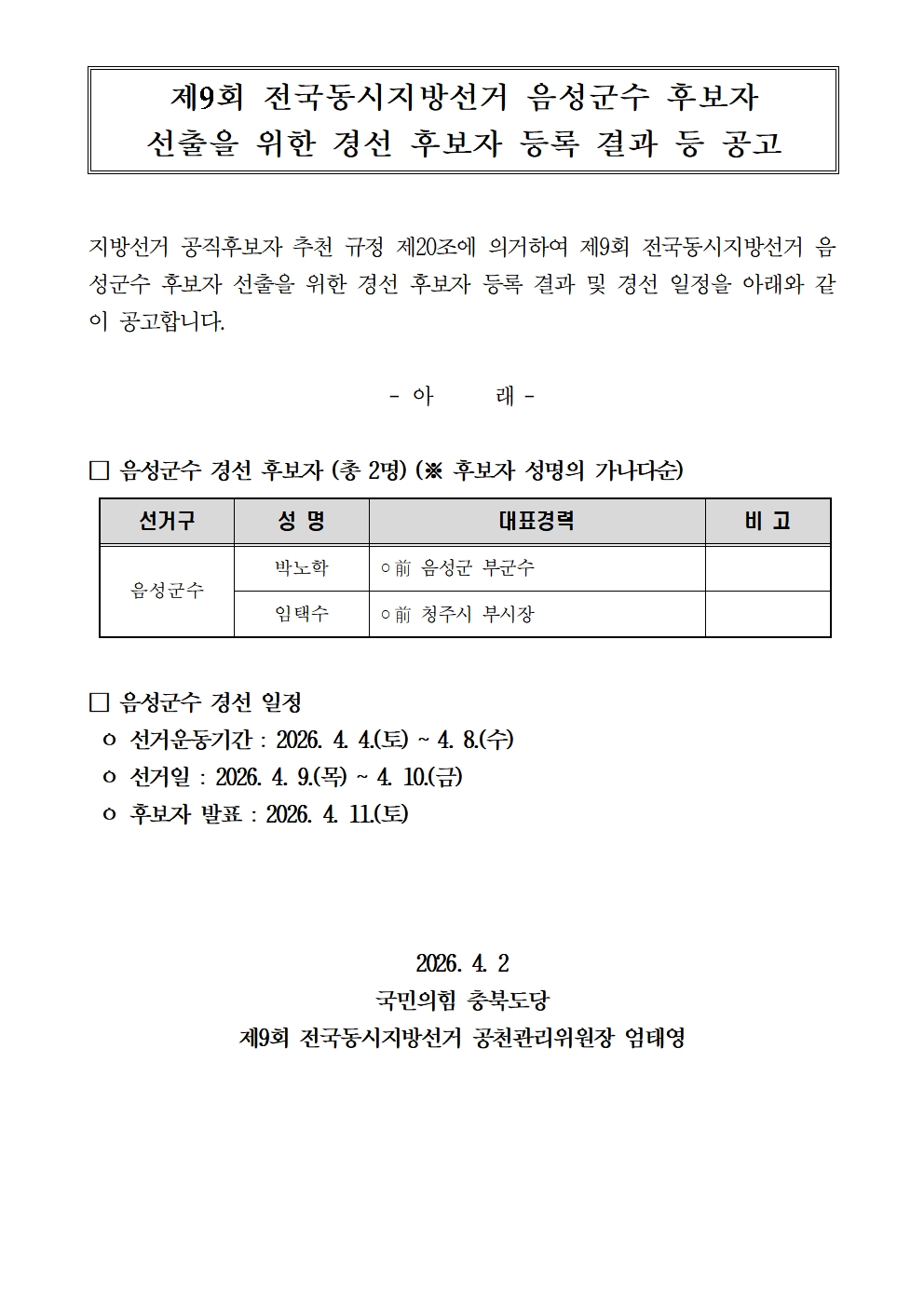 Á¦¸ñ Á¦9ȸ Àü±¹µ¿½ÃÁö¹æ¼±°Å À½¼º±º¼ö Èĺ¸ÀÚ ¼±ÃâÀ» À§ÇÑ °æ¼± Èĺ¸ÀÚ µî·Ï °á°ú °ø°í
