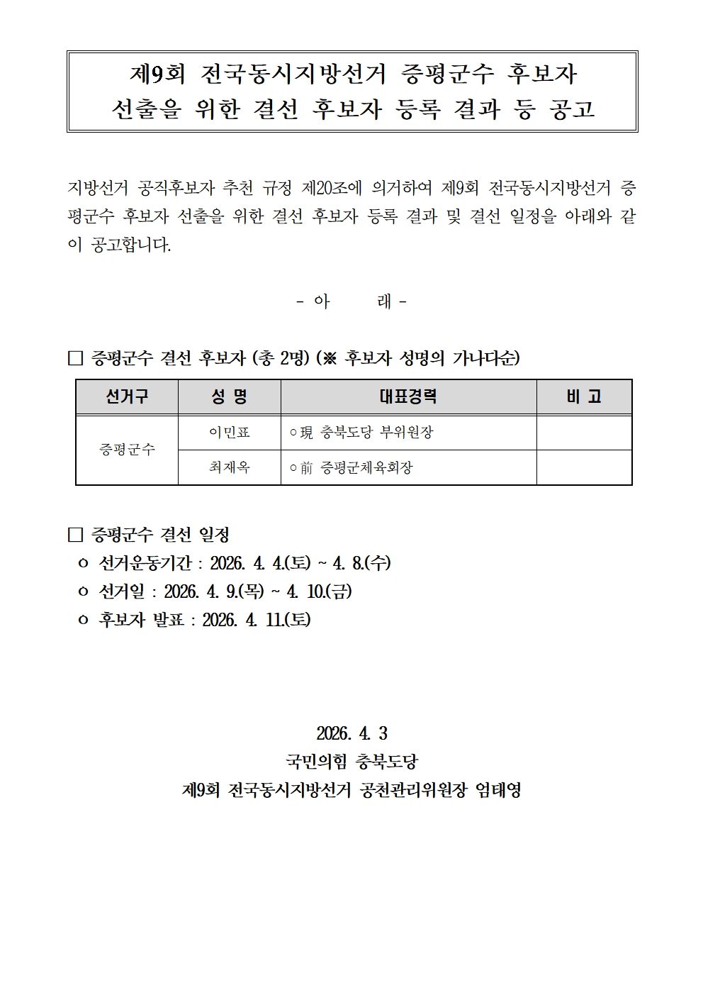 Á¦¸ñ Á¦9ȸ Àü±¹µ¿½ÃÁö¹æ¼±°Å ÁõÆò±º¼ö Èĺ¸ÀÚ ¼±ÃâÀ» À§ÇÑ °á¼± Èĺ¸ÀÚ µî·Ï °á°ú µî °ø°í