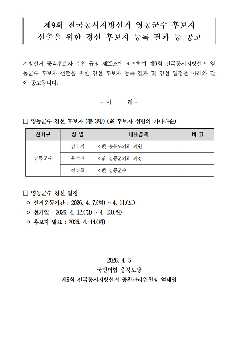 Á¦¸ñ Á¦9ȸ Àü±¹µ¿½ÃÁö¹æ¼±°Å ¿µµ¿±º¼ö Èĺ¸ÀÚ ¼±ÃâÀ» À§ÇÑ °æ¼± Èĺ¸ÀÚ µî·Ï °á°ú °ø°í