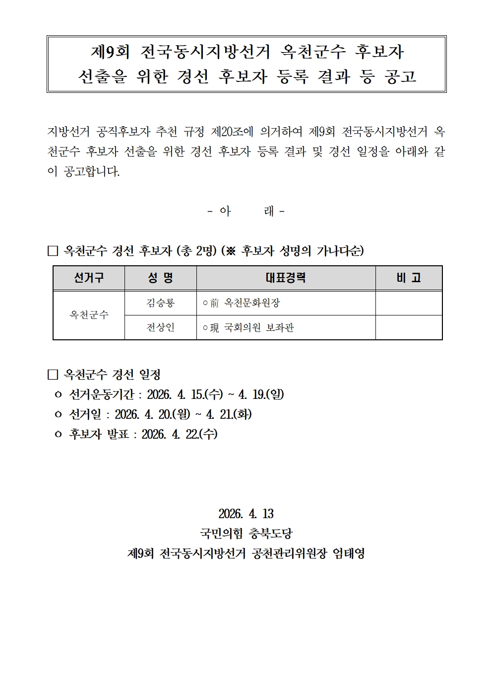 Á¦¸ñ Á¦9ȸ Àü±¹µ¿½ÃÁö¹æ¼±°Å ¿Áõ±º¼ö Èĺ¸ÀÚ ¼±ÃâÀ» À§ÇÑ °æ¼± Èĺ¸ÀÚ µî·Ï °á°ú °ø°í