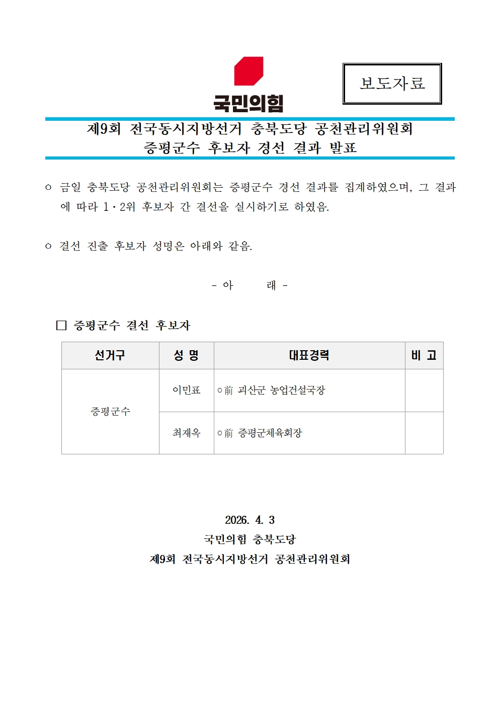 Á¦¸ñ Á¦9ȸ Àü±¹µ¿½ÃÁö¹æ¼±°Å ÃæºÏµµ´ç °øÃµ°ü¸®À§¿øÈ¸ ÁõÆò±º¼ö Èĺ¸ÀÚ °æ¼± °á°ú ¹ßÇ¥